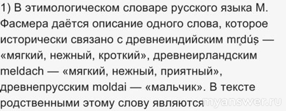 1) В этимологическом словаре русского языка М. Фасмера даётся описание одного слова, которое исторически связано с древнеиндийским mr̥dúṣ — «мягкий, нежный, кроткий», древнеирландским meldach — «мягкий, нежный, приятный», древнепрусским moldai — «мальчик». В тексте родственными этому слову являются