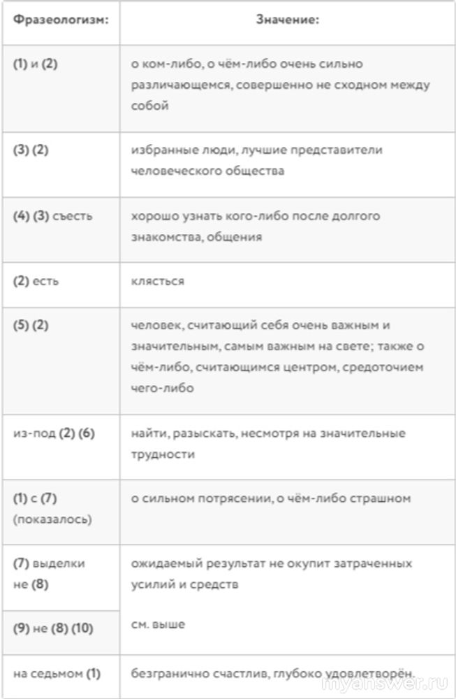 Интересное задание. Не читала Вашего ответа, когда думала. Можно дать свой ответ? Тем более, что в Вашем ответе не хватает еще одного фразеологизма, а именно 9 не (8) (10).