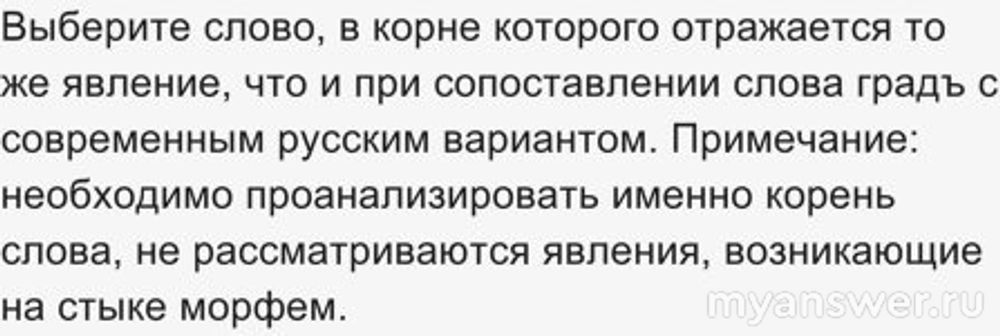 Выберите слово, в корне которого отражается то же явление, что и при сопоставлении слова градъ с современным русским вариантом. Примечание: необходимо проанализировать именно корень слова, не рассматриваются явления, возникающие на стыке морфем.