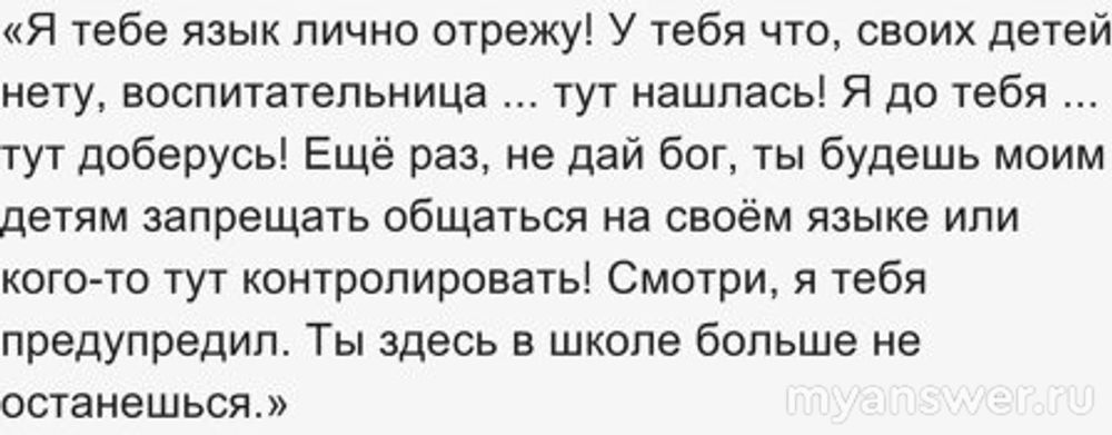 19 сентября дети баловались на перемене, поэтому классный руководитель сделала им замечание. Ученики проигнорировали это замечание и стали общаться на своём языке. Учитель попросила говорить по-русски, на что дети её послали и пригрозили пожаловаться папе.
