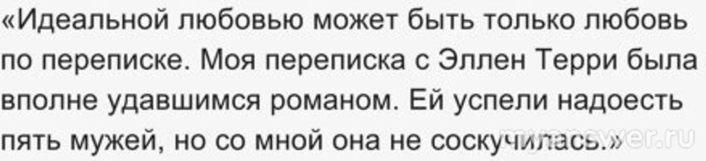 Самая страстная «идеальная» любовь по переписке у Бернарда Шоу была с актрисой Эллен Терри, которая была старше писателя на 9 лет. Эта любовь имела все признаки обычной любви: ссоры, ревность, примирения, разочарования, охлаждения. Высший накал любви по переписке между двумя семейными людьми достиг, когда Эллен было 70 лет.