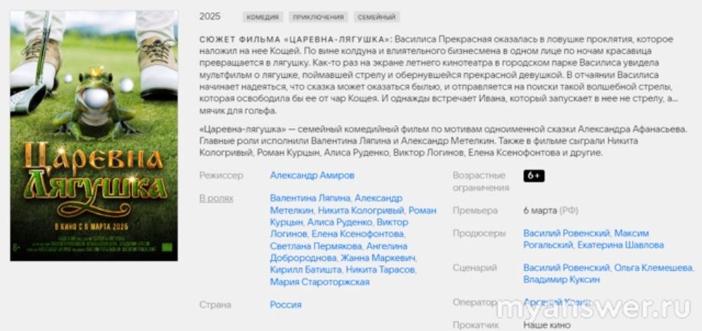 Фильм "Царевна-лягушка" в жанре семейный, приключения, фэнтези. Режиссер фильма Александр Амиров. Актерский состав: Валентина Ляпина, Александр Метёлкин, Роман Курцын, Никита Кологривый, Виктор Логинов, Светлана Пермякова, Кирилл «Батишта» Петров. Премьера фильма "Царевна-лягушка" ожидается 6 марта 2025 года.