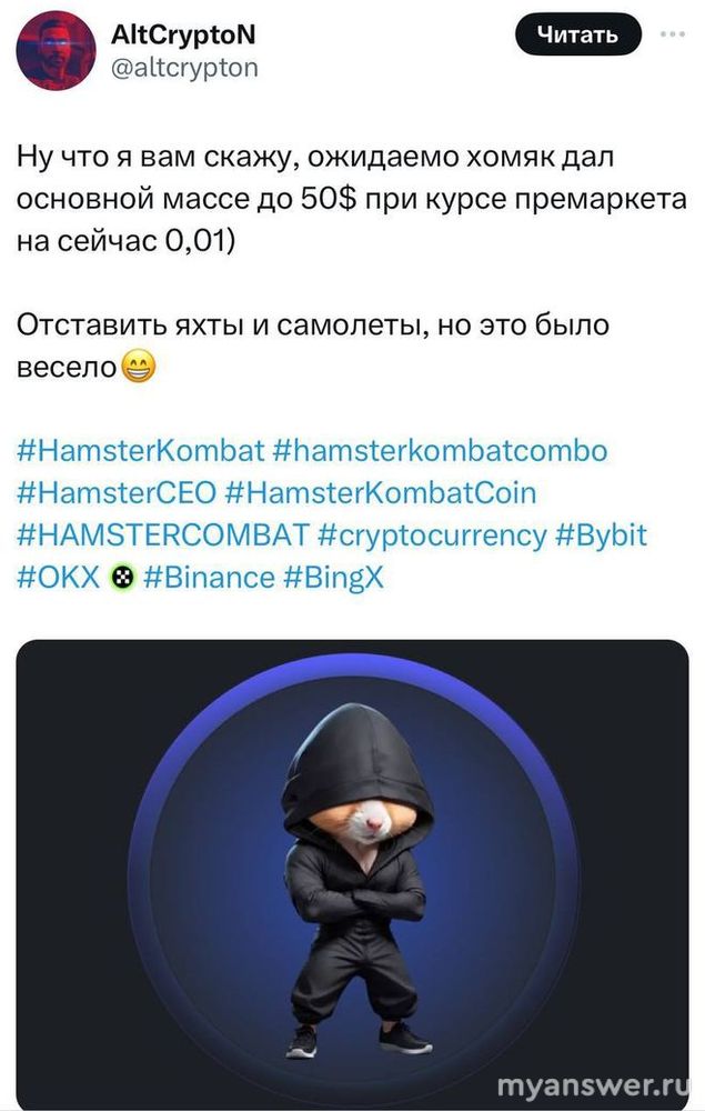 При той цене, когда Токен хомяка в Премаркете равен одному 1 центу, получается, что в итоге тысяча монет будет равны десяти долларам, и это, конечно, мало. То есть после такого курса стало понятно то, что обогатиться на игре Хамстер Комбат у подавляющего большинства игроков никак не получится. В целом, по отзывам людей, уже сейчас понятно, что большая их часть была обескуражена таким курсом.