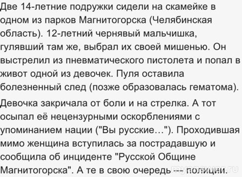 Вся проблема только в только в конфликте на национальной почве. Приехали представители общественности с двух сторон. До серьезных "разборок" дело не дошло. Серьезных проблем со здоровьем девочке "выстрел" не причинил. И не будь мальчишка из мигрантов ни кто бы не обратил на этот случай внимание.