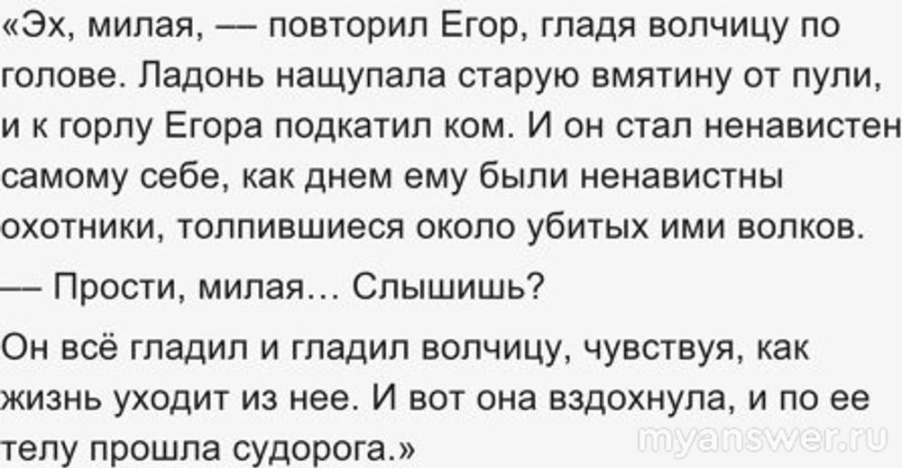 Ответ на вопрос: книга «Весьегонская волчица» заканчивается смертью волчицы на руках у охотника.