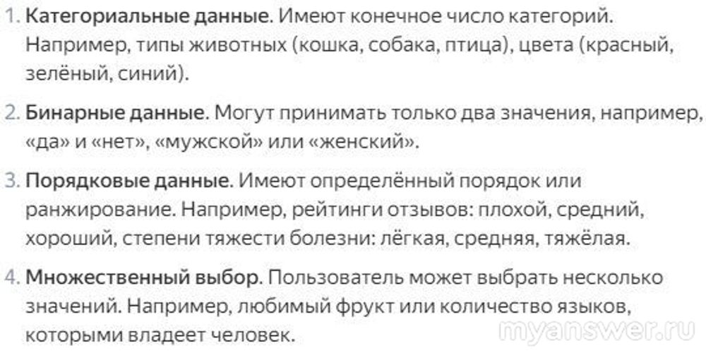 Подобные данные поддаются лишь описанию, но никак не исчислению, их, конечно, можно распределить в некие категории, например, на "бинарные", то есть такие, что могут быть выбраны лишь из двух имеющихся вариантов - мужской/женский. Более подробное подразделение качественных данных в биологии показано на скрине: