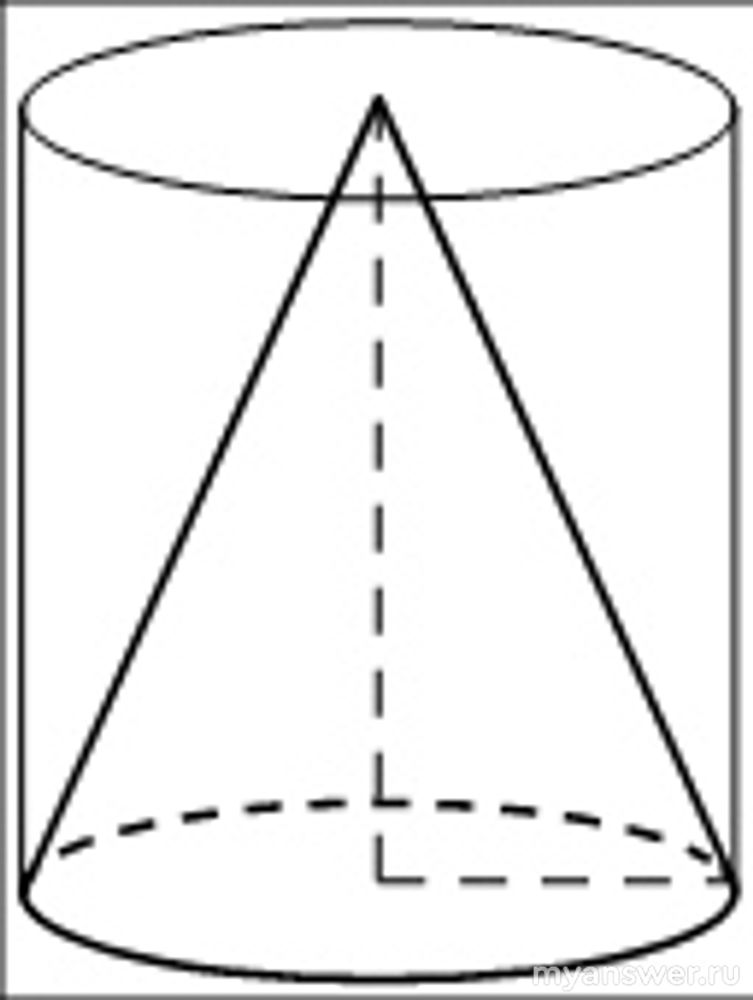 Поскольку в этом конкретном случае, как следует из условия задачи, площадь основания и высота у обеих фигур одинаковые, то тогда искомый объём конуса будет составлять всего треть объёма цилиндра и будет равен, соответственно:
