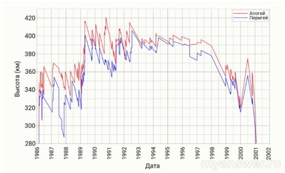 На графике представлены параметры орбиты станции «Мир» за всё время её существования.