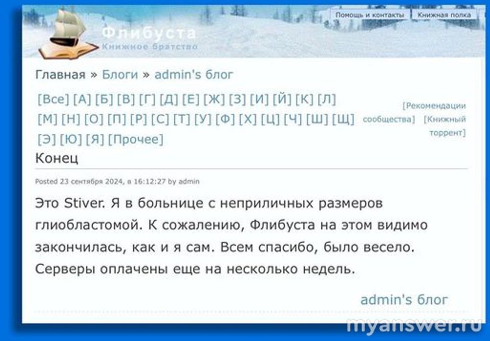 Библиотека "Флибуста" которая приносила столько пользы и радости людям, скоро прекратит свое существование. Создателем данной библиотеки является человек, который известен широкой публики под ником Stiver. Так вот, у него нашли тяжелое онкологическое заболевание, и после того, как сам Stiver узнал о своем диагнозе, он объявил о том, что библиотека закроется. Флибуста должна еще работать несколько недель, так как ее серверы были оплачены заранее, а потому еще есть шанс скачать от туда нужные книги.
