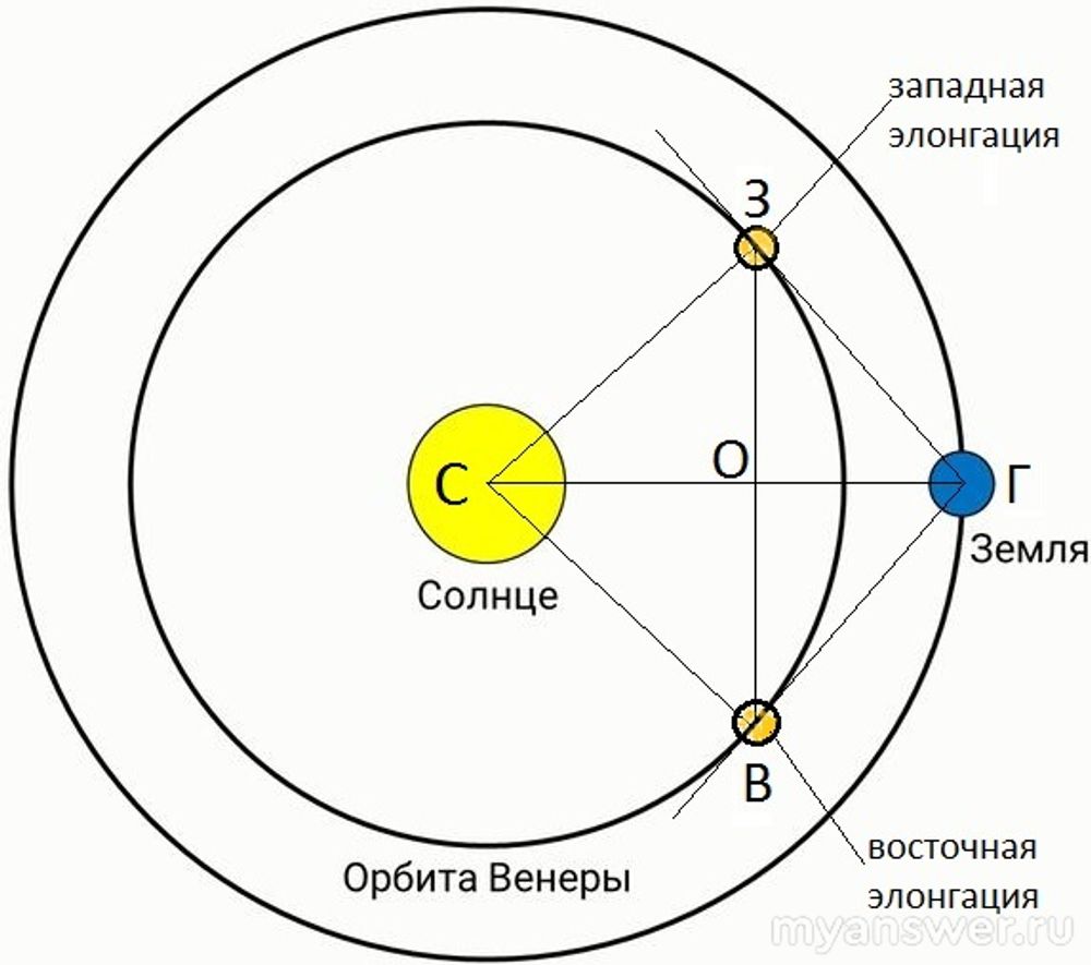 Положение Венеры на орбите, когда ее угловое расстояние от Солнца кажется земному наблюдателю максимальным, называется элонгацией. Различают восточную и западную элонгации.