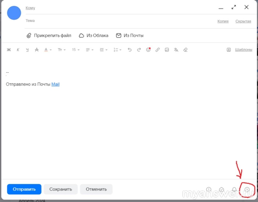 Для этого заходим в почту и открываем "написать письмо". Пишем адрес, тему, текст письма, прикрепляет файлы, если необходимо. В общем, оформляем письмо. Далее справа, внизу страницы ищем изображение часиков.