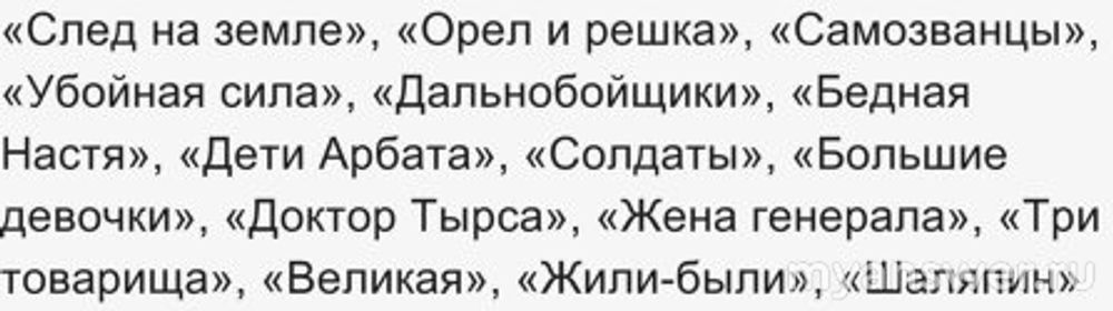 А ещё "Убойная сила", "СуперБобровы", "Есенин" "По щучьему велению" - а так очень много интересных фильмов и сериалов,что не перечислить.