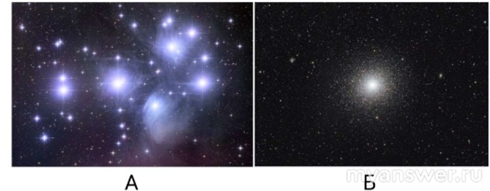 Даны фотографии ярчайших представителей двух типов звёздных скоплений, наблюдаемых в нашей Галактике.