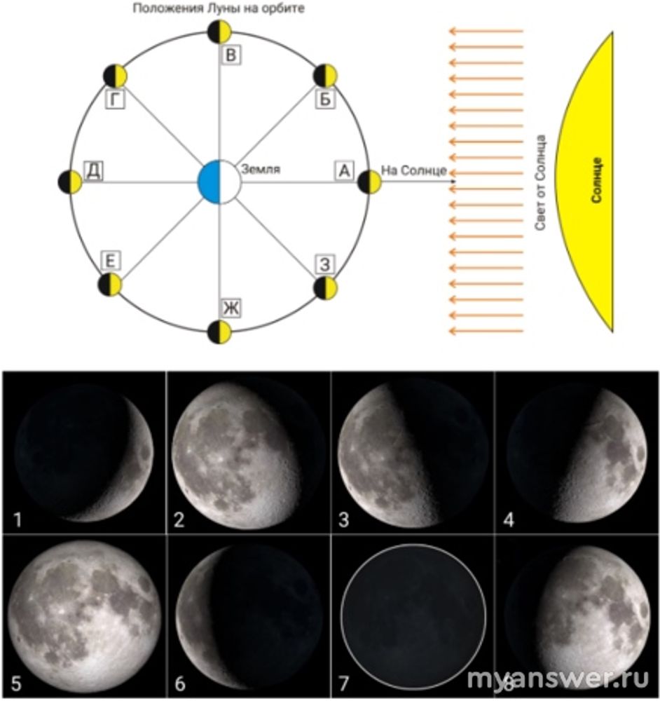На рисунке представлены Солнце, Земля и орбита Луны (без сохранения масштаба) с указанием некоторых характерных точек (обозначены заглавными буквами в квадратах) её положений. Также даны изображения Луны в этих положениях, наблюдаемые в течение одного синодического месяца жителем Северного полушария.