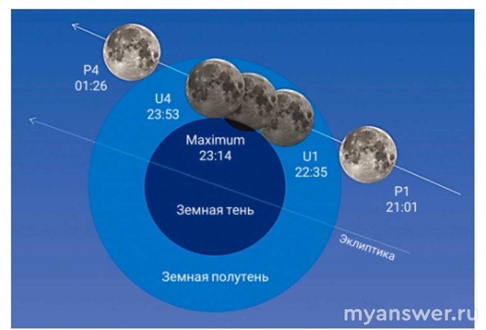 Дана схема лунного затмения, наблюдавшегося с территории России 28 октября 2023 года, с указанием его основных фаз.