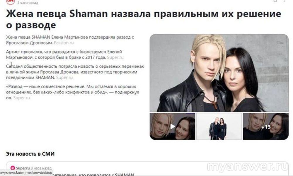 Действительно, появилась информация о том, что певец Ярослав Дронов, больше известный поклонникам и слушателям под сценическим псевдонимом Шаман, разводится со своей второй супругой Еленой Мартыновой, которая старше его на 14 лет. И что оба они уже официально её подтвердили.