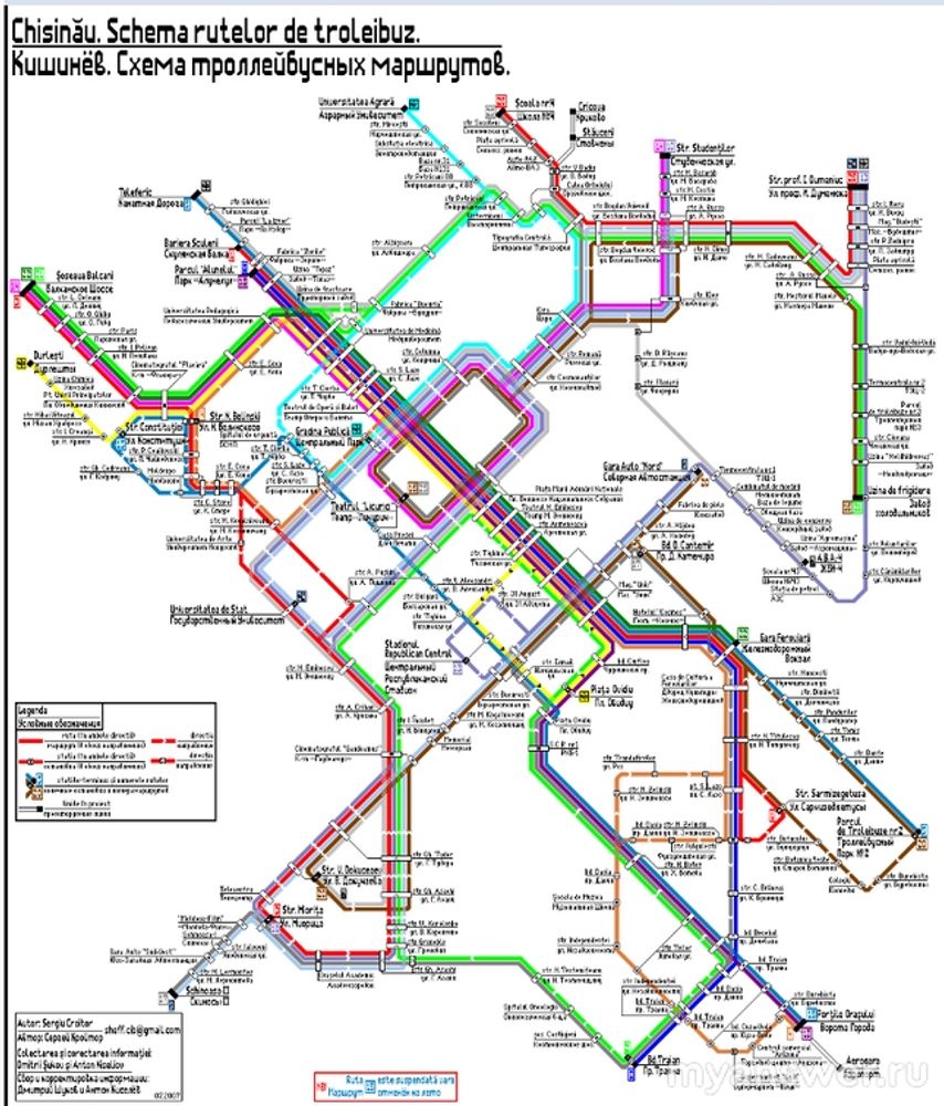 Вот наша схема троллейбусных маршрутов. Правда, вы же видите, что у 13-го троллейбуса его юго-западной конечной остановкой пока ещё является Республиканский стадион, ныне беспощадно уничтоженный, ушедший в прошлое, поросший трын-травой и сданный американцам в аренду под территорию строящегося нового посольства/консульства США. Выходит, эта троллейбусная схема может быть примерно 2010 года... Ну, не сердитесь: более новую Википедия пока не даёт.