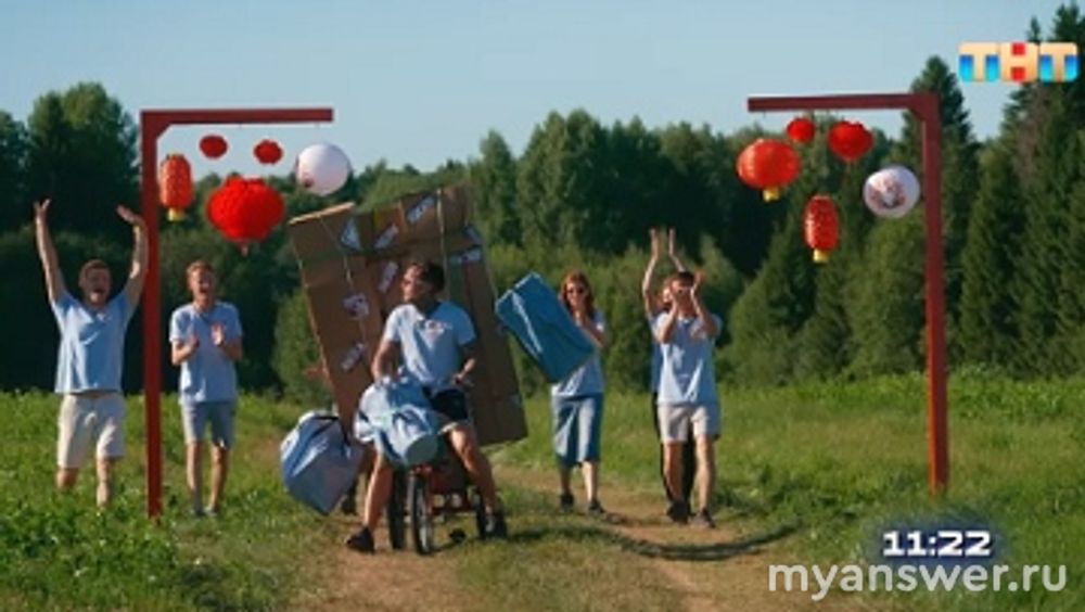 Следовательно, пять правильных ответов – пять стогов. А в стогах спрятаны фишки. Пять собранных фишек нужно отнести Мастерице игр, взамен получить буквы. Из них составить слово. А сделать это должен китайский участник.