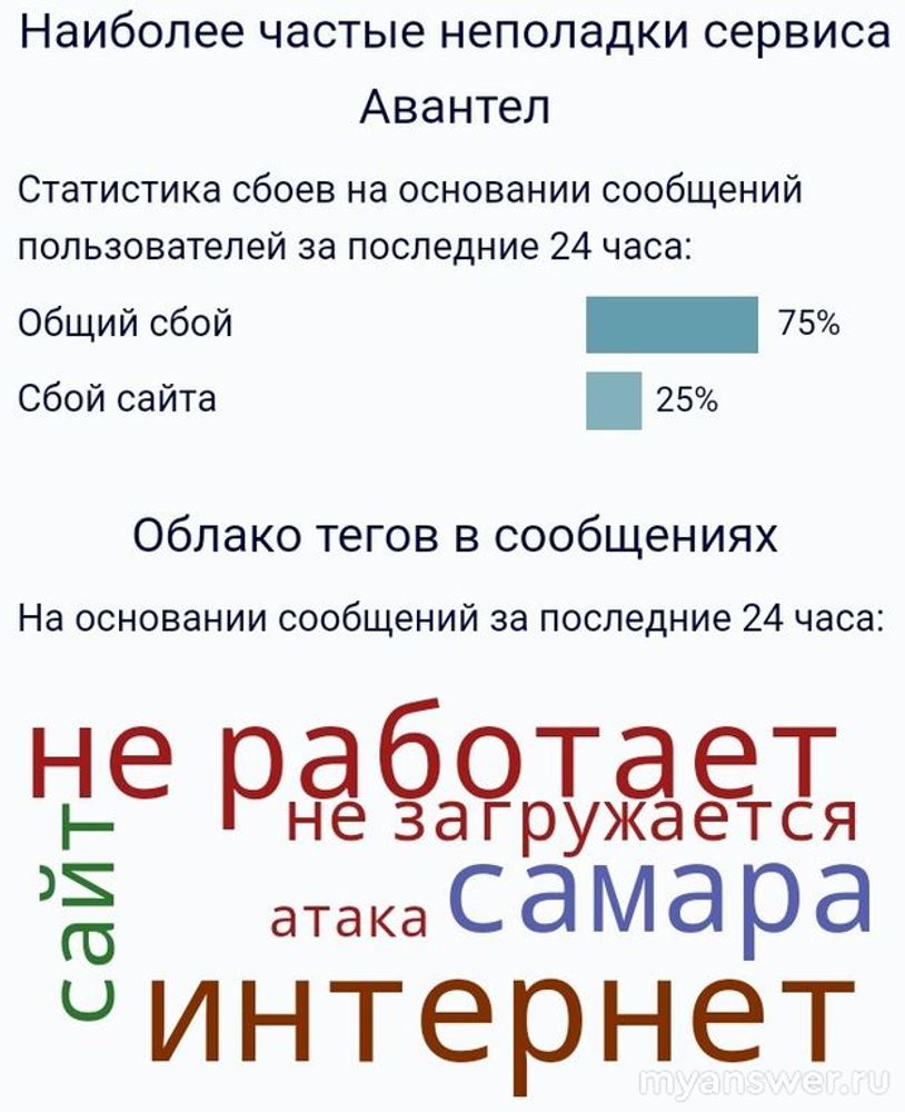 В пятницу, 27 сентября 2024 года, массово засбоили различные сервисы от Интернет-провайдера "Авантел" в городе Самаре и Самарской области нашей страны. По характеру сетевых сбоев это не похоже на внешнее воздействие, поэтому в данном случае гораздо большая вероятность того, что произошли технические проблемы на магистральных линиях связи. В любом случае, лучше всего будет уточнить все возникшие вопросы в службе технической поддержки компании "Авантел", контакты которой предоставлены ниже.