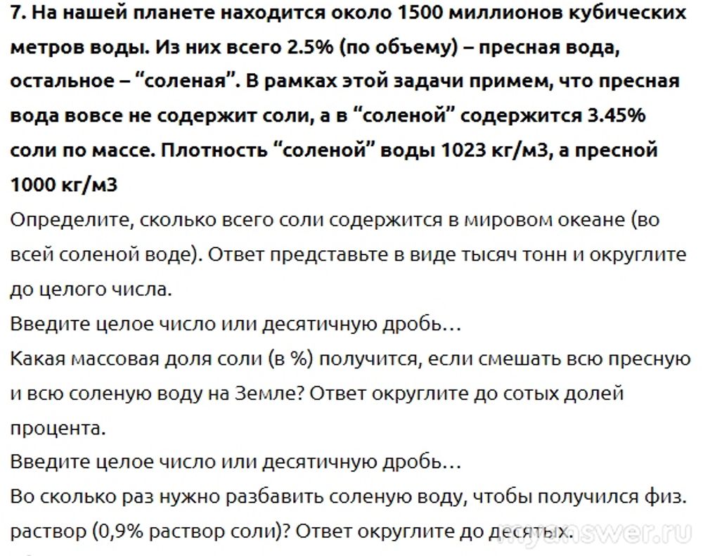 Да, составители задачи, конечно, накосячили. Так дезинформировать школьников в олимпиадной задаче. На самом деле, на планете Земля около 1500 миллионов кубических километров воды. А в 1 кубическом километре миллиард кубических метров. Вот такая вот огромная разница. Но мы будем решать по данным задачи (предположим, что речь идёт об уменьшенной копии нашей планеты).