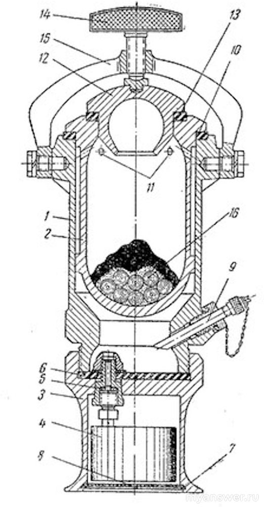 В стакан 2 засыпают пробу грунта, а в крышку-чашку 12 – измельченный карбид кальция. Прибор держат в горизонтальном положении и надевают крышку-чашку, конструкция которой обеспечивает непросыпание из нее карбида кальция при монтаже прибора. Затем опускают коромысло 15 и затягивают прижимной винт 14. Карбид кальция с пробой смешивают с помощью шариков 16, помещенных в стакан. Давление выделившегося при этом газа фиксируется манометром.