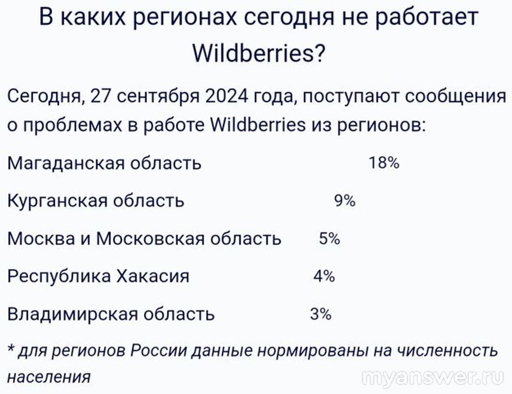 Однако, я смотрю статистику по регионом России, и 27.09.2024 жалобы поступают пользователей из Владимирской, Магаданской, Курганской областей, а также из Москвы и Московской области, Республики Хакасии. В выше обозначенных регионах России наблюдаются проблемы в работе сайта Вайлдберриз. Я бы рекомендовал пытаться зайти позже на сайт, явно сбой временный, восстановительные работы пройдут быстро.