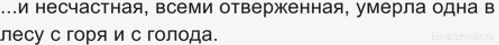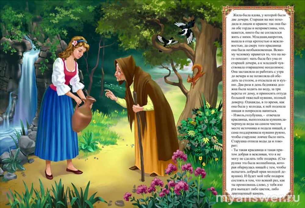 Та напилась и сказала с доброй улыбкой: "А я ведь хотела всего лишь проверить, правду ли о твоём благонравии говорят в округе... Прими и ты мой дар: с этой минуты, стоит тебе вымолвить слово, с уст твоих будут падать прекрасные цветы да драгоценные каменья".