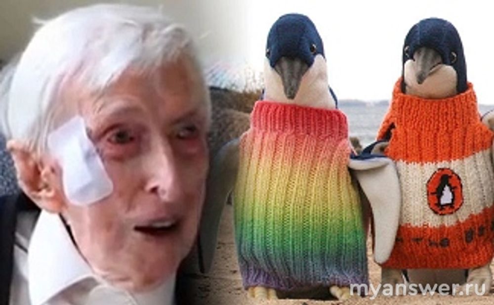 109 тилетний Альфред Дейт откликнулся на призыв общественной организации помочь пингвинам, связав для них свитер, защищающий от нефти, которая для них губительна.