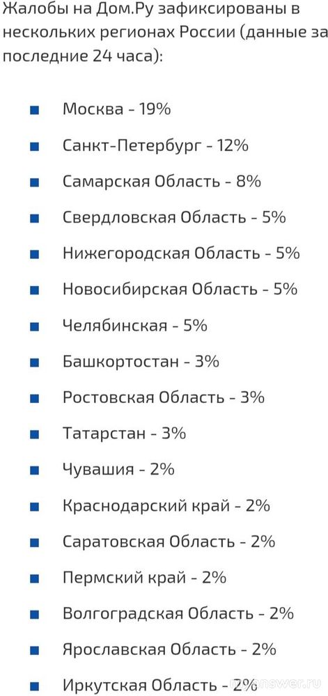Но а по регионам, в которых наблюдалась проблемы с функционированием Дом.ру, наблюдалась картина, оьозначенная ниже, согласно которой большинство жалоб поступало от жителей Москвы и северной столицы России.