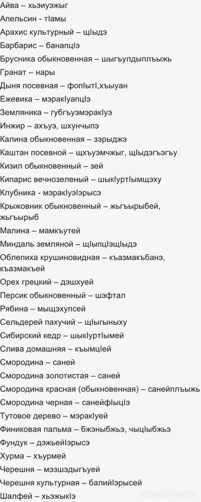 Если большинство знает, как по - кабардински будет клубника, вишня, арбуз, дыня, то кто немногие смогут сказать как будет апельсин на кабардинском, как будет ежевика, брусника, гранат, персик, смородина, черешня, калина, барбарис, айва.