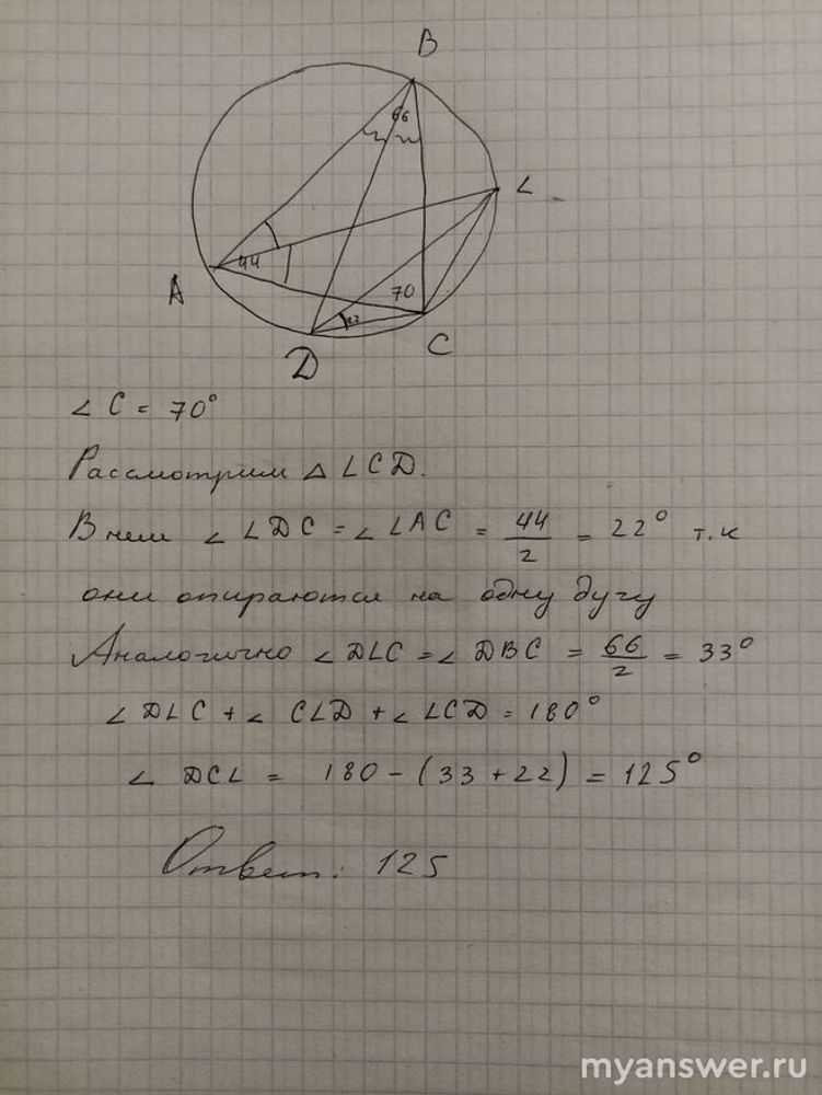 В треугольнике ABC угол A = 44, а угол B = 66. Продолжение биссектрисы угла А пересекает описанную окружность треугольника в точке L, а продолжение биссектрисы угла В - в точке D. Найти LCD