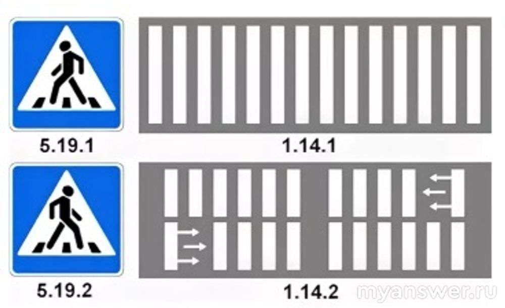 МЫ знаем, что пешеходный переход, это специально выделенный участок дороги для прохода по нему пешеходов. Пешеходный переход может быть регулируемым, то есть с установленным светофором, знаком "пешеходный переход" и дорожной разметкой и нерегулируемым, где возможность переходить дорогу обозначена знаком пешеходного перехода и дорожной разметкой. Это дорожные разметки 1.14.1 ( при ширине дороги до 6-ти метров) или 1.14.2 ( при ширине дороги более 6 метров) и водители обязаны уступать пешеходам дорогу, как только пешеход ступил на дорожную часть. Пешеходные переходы имеющие разметки 1.14.1 и 1.14.2, позволяющие пересекать проезжую часть наискосок, при наличии светофора, называются диагональными пешеходными переходами, они могут быть только регулируемыми, первый вариант ответа.