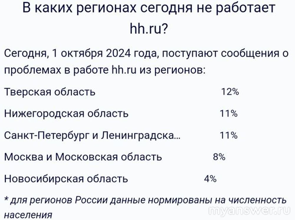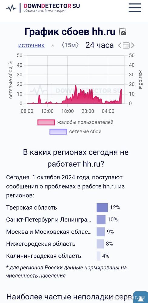 с 30 сентября и сегодня 1 октября 2024 года не работает крупнейший сервис по поиску работников и сотрудников в интернете hh ru (HeadHunter) в некоторых регионах России. В основном это Санкт-Петербург и Тверская область, Нижегородская, Московская и Новосибирская области. Хотя мониторинг сетей интернет на данное время - 15 часов дня (по-московскому времени) показывает на своих графиках статус сайта как - "доступен", а жалобы пользователей прекратились поступать час назад.
