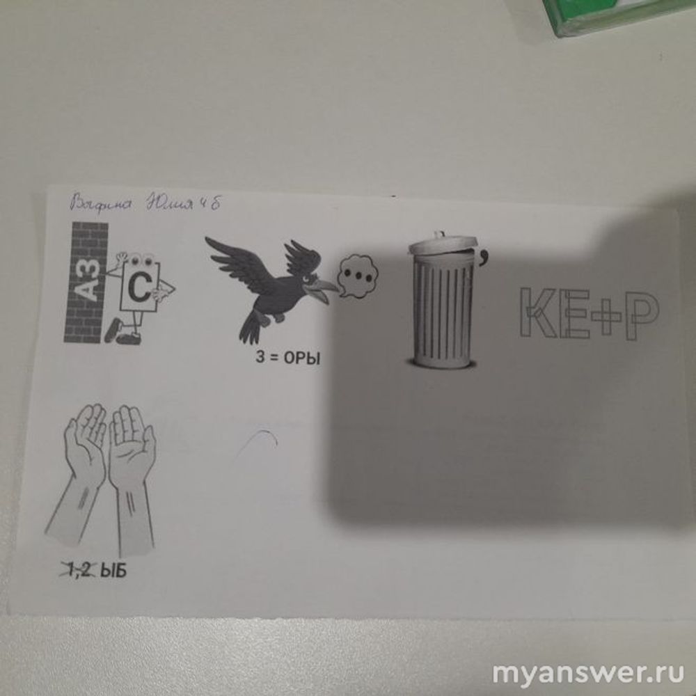 Ворона что-то говорит — там речевое облачко. Значит, нужно взять не саму ворону, а звукоподражание, которое она произносит. Это слово "кар". Тройка со знаком "равно" означает, что третью букву нашего слова "кар" нужно заменить. Кар ---> каоры. Ну, тут только интуиция нам подскажет, что нужно ещё дополнительно вставить два пробела: не "каоры", а фактически ка о ры.