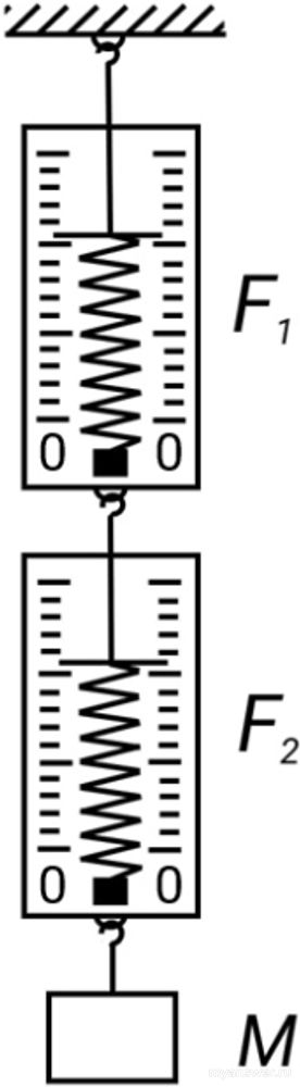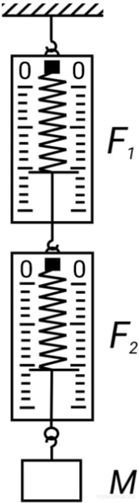 Два одинаковых динамометра и груз соединили так, как показано на рисунке. Показания верхнего и нижнего динамометров F1=3 Н и F2=1 Н соответственно. Ускорение свободного падения g=10 Н/кг.