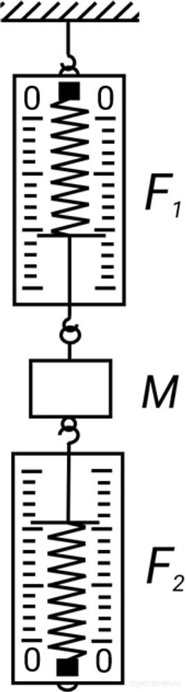 Динамометры и груз поменяли местами так, как показано на рисунке. Чему теперь равно показание F1 верхнего динамометра?