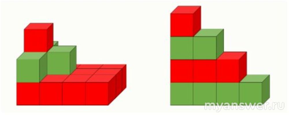 Из зелёных и красных кубиков одинакового объёма дети собрали две пирамиды. Плотность красных кубиков в 5 раз больше плотности зелёных. Цвета кубиков в одном ряду одинаковые.