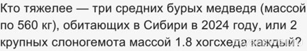Кто тяжелее — три средних бурых медведя (массой по 560 кг), обитающих в Сибири в 2024 году, или 2 крупных слоногемота массой 1.8 хогсхеда каждый?