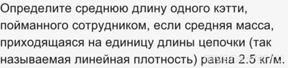 Мелкие грызуны, атакующие фермеров планеты, так и называются «кэтти», потому что их средняя масса равна 1 кэтти. На планете есть служба отлова кэтти, сотрудники которой временно усыпляют грызунов и увозят подальше от фермерских хозяйств. Как‑то один сотрудник выложил всех пойманных кэтти в ряд и получил цепочку длиной 3 метра. Определите среднюю длину одного кэтти, пойманного сотрудником, если средняя масса, приходящаяся на единицу длины цепочки (так называемая линейная плотность) равна 2.5 кг/м. Ответ выразите в сантиметрах, округлите до целых.