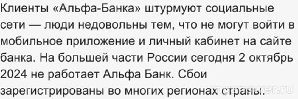 Не работает сайт, приложение и личный кабинет Альфа-Банк Онлайн 02.10.2024 года, почему, что делать?