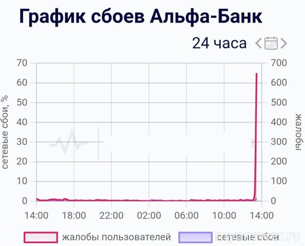 В промежутке с 13:00 до 14:00 по московскому времени 2 октября 2024 года случился мощный сетевой сбой у банка Альфа-Банк. При этом, стоит отметить, что до сбоя работу банка можно оценить, как стабильная.