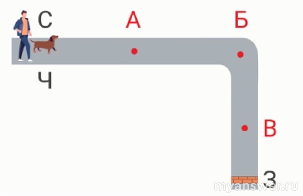 Длина дороги, по которой идёт человек, на участке от человека (Ч) до забора (З) составляет 400 метров. Скорость человека постоянна по модулю и равна 0.5 м/с. В начальный момент времени рядом с человеком находится собака (С), которая с постоянной по модулю скоростью 5 м/с бежит по дороге в сторону забора.
