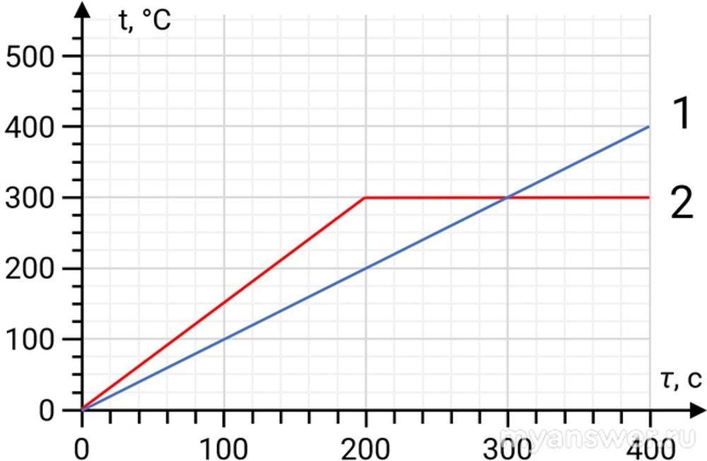 Определите удельную теплоту плавления второго образца, если к моменту τ=300 с расплавилось 1000 грамм этого вещества.