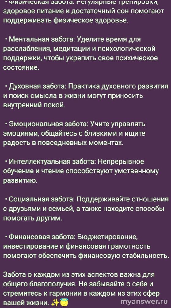 То есть, если работать во всех направлениях, то будет всё хорошо и во всех сферах жизни. Даже не будет времени ныть и говорить, как всё плохо. Я знаю, потому что всеми видами заботы себя окружаю.