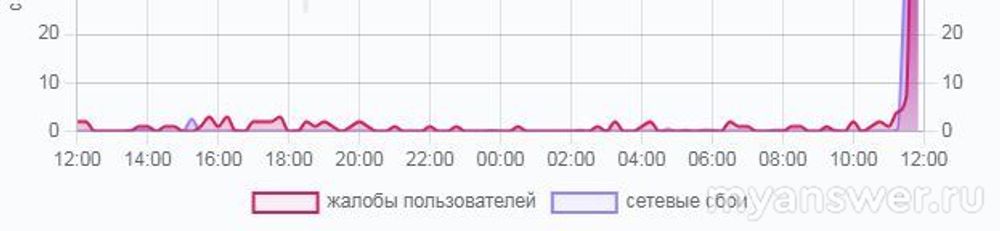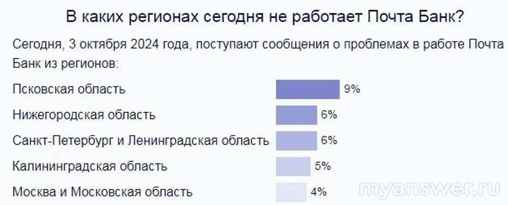 Заметьте, сетевой сбой, а он тут на диаграмме синий, перед жалобами взлетел тоже, а это уже указывает на существенные такие у Почта банк проблемы, их могут и быстро исправить, а могут и не так резво, как хотелось бы. По местам, где сегодня не работает приложение Почта банк такое есть на скрине: