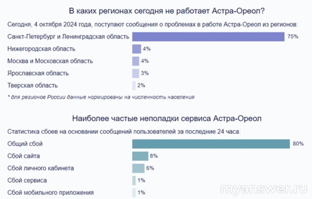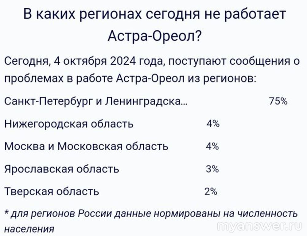 Интернет провайдер Ленинградской области "Астра-Ореол" не работает 4-го октября 2024 года в некоторых регионах России, особенно в Санкт-Петербурге и Ленинградской области. Мониторинг на графике показывает сильнейший сетевой сбой, который может быть вызван только дос-атаками на Астру-Ореола.
