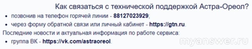 Ниже расположены также номера и адреса для связи с технической поддержкой с провайдером Астра-Ореола: