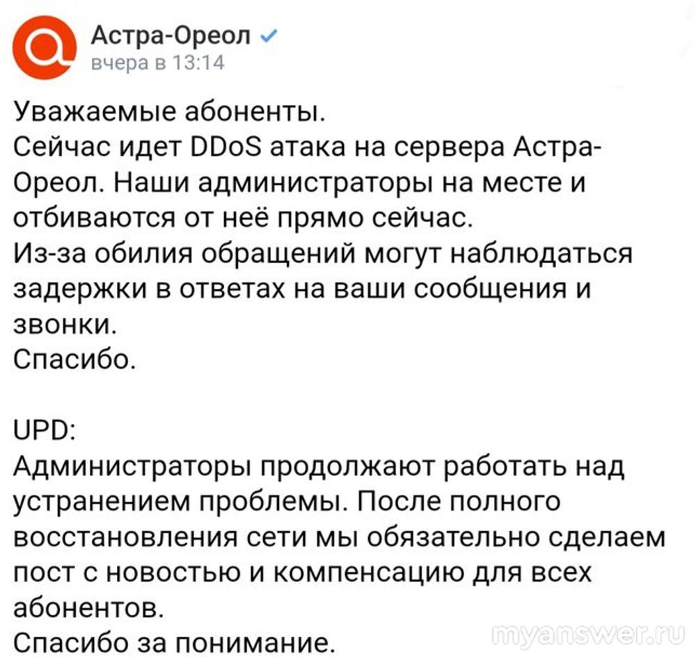 Также приятно, что провайдер в сообщении заверил, что после устранения неполадок будет сделана компенсация для всех абонентов.