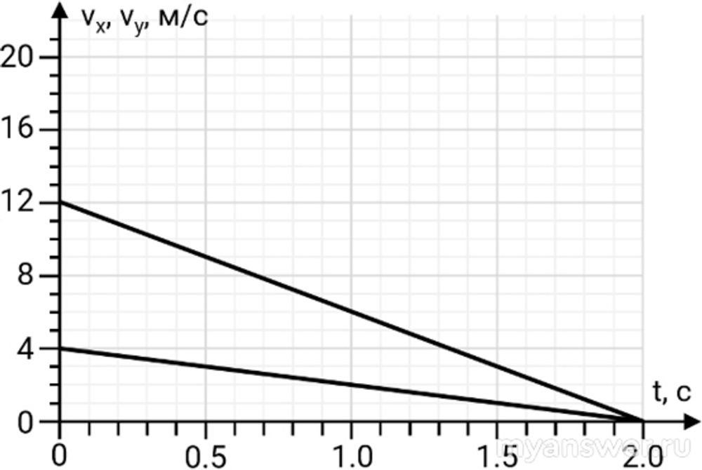 На рисунке показаны графики зависимостей от времени проекций его скорости на оси x и y.