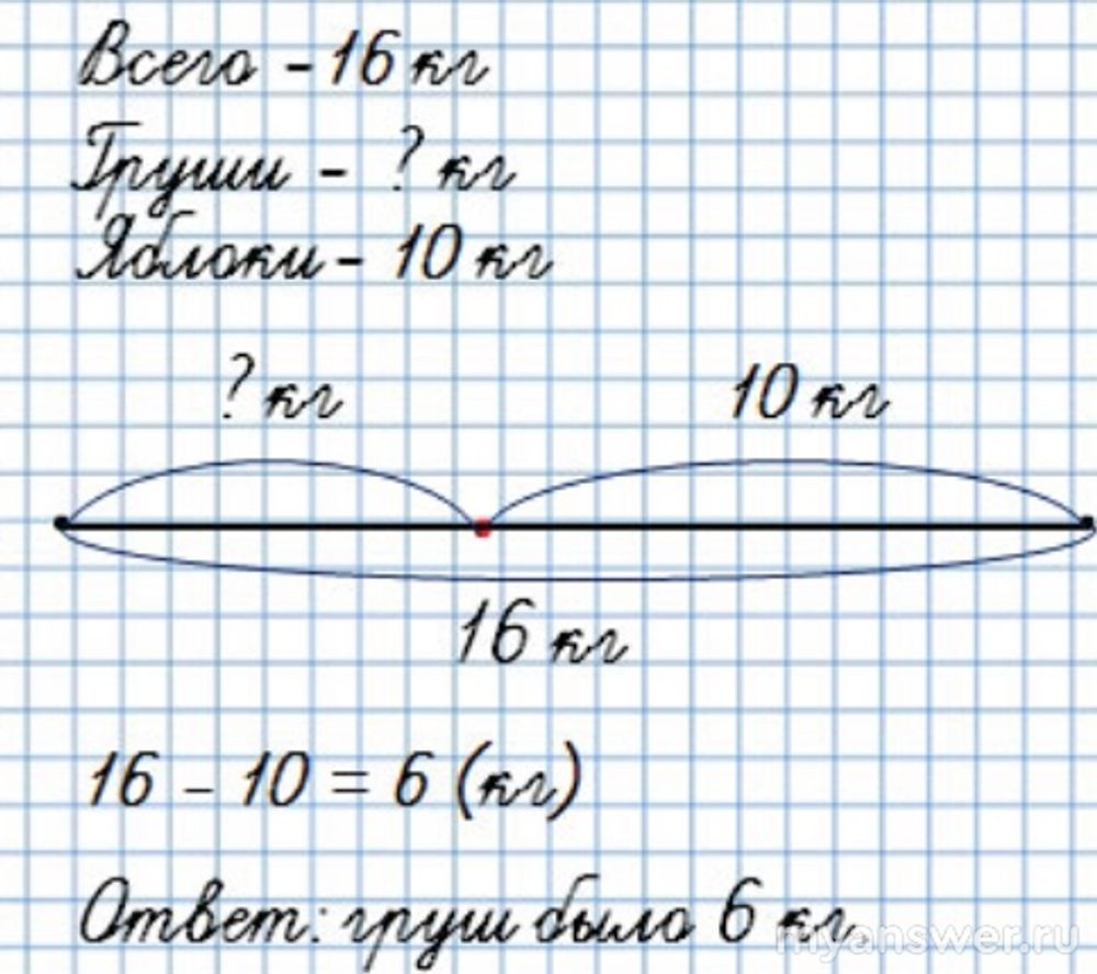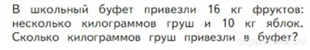 В школьный буфет привезли 16 кг фруктов: несколько килограммов груш и 10 кг яблок. Сколько килограммов груш привезли в буфет?